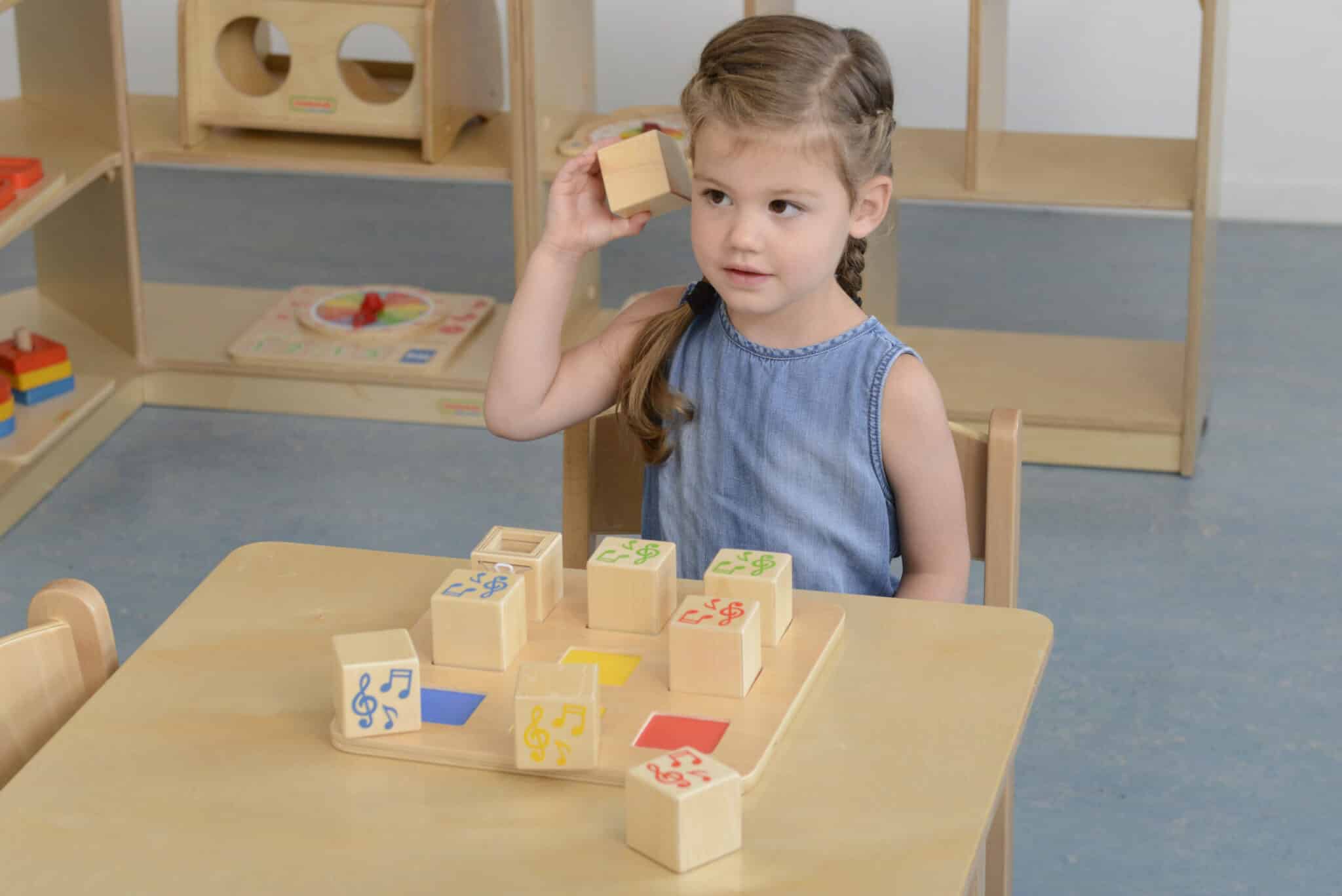 Osiem drewnianych kosteczek, które przy potrząśnięciu wydają różne dźwięki. Dzieci mają za zadanie dopasować pary kosteczek, które wydają takie same dźwięki. W zestawie znajduje się również pusta kosteczka, do której można włożyć dowolne obiekty: np. piasek, kamyki, drobne klocki, by sprawdzić jaki dźwięk będą wydawały przy potrząsaniu.